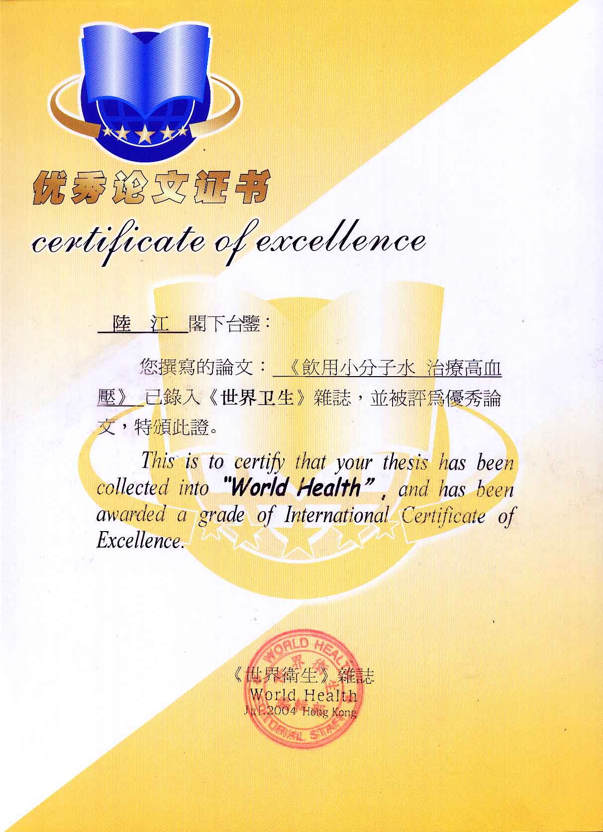 一.發(fā)明的亮點是中國基礎(chǔ)醫(yī)學研究成果的轉(zhuǎn)化醫(yī)學應(yīng)用------------------------------------------------------------------------------------ 1990年春,我50歲,發(fā)現(xiàn)患了高血壓,便及時遵醫(yī)囑服藥。我想起父輩、祖輩曾患高血壓,后來都患中風癱瘓或心梗過世,所以心中壓力大。我夢想能根治高血壓,便研究醫(yī)學。當我檢索到中國基礎(chǔ)醫(yī)學研究成果,采用高脂餐和磁處理小分子團水飼喂小白鼠或大白免等兩組哺乳動物,經(jīng)過2、4、6個月剖殺血檢,發(fā)現(xiàn)飼喂小分子團水的試驗組動脈內(nèi)壁干凈,能減輕和延緩動脈粥樣硬化。我從這些研究成果受到啟發(fā)。覺得有責任研制出優(yōu)良的器具,讓天下人能真正治愈高血壓,消除動脈粥樣硬化,延年益壽。于是,1990年我做成樣品,先后與愛人飲用兩三個月,分別治愈了高、低血壓,之后我們的血壓都正常,癥狀消失。該水經(jīng)南京大學做核磁共振檢測為55.82赫茲的微小分子團水。該品經(jīng)工業(yè)開發(fā)后,1994年送給廣西三家三甲醫(yī)院做臨床試用4個月,再經(jīng)北京和廣西醫(yī)學專家鑒定認為:“降脂降壓效果好” ,“能擴大心腦動脈流量,改善心腦電圖和微循環(huán)” ,“對治療心腦動脈粥樣硬化、高血壓、高血脂有良好的醫(yī)療保健作用”。1996年產(chǎn)品獲得中國發(fā)明專利權(quán)。這就使產(chǎn)品可以轉(zhuǎn)化為醫(yī)學應(yīng)用,人類可逐漸改變終生服藥,自己祛除病癥。