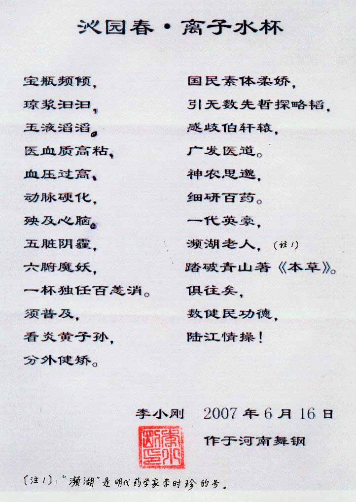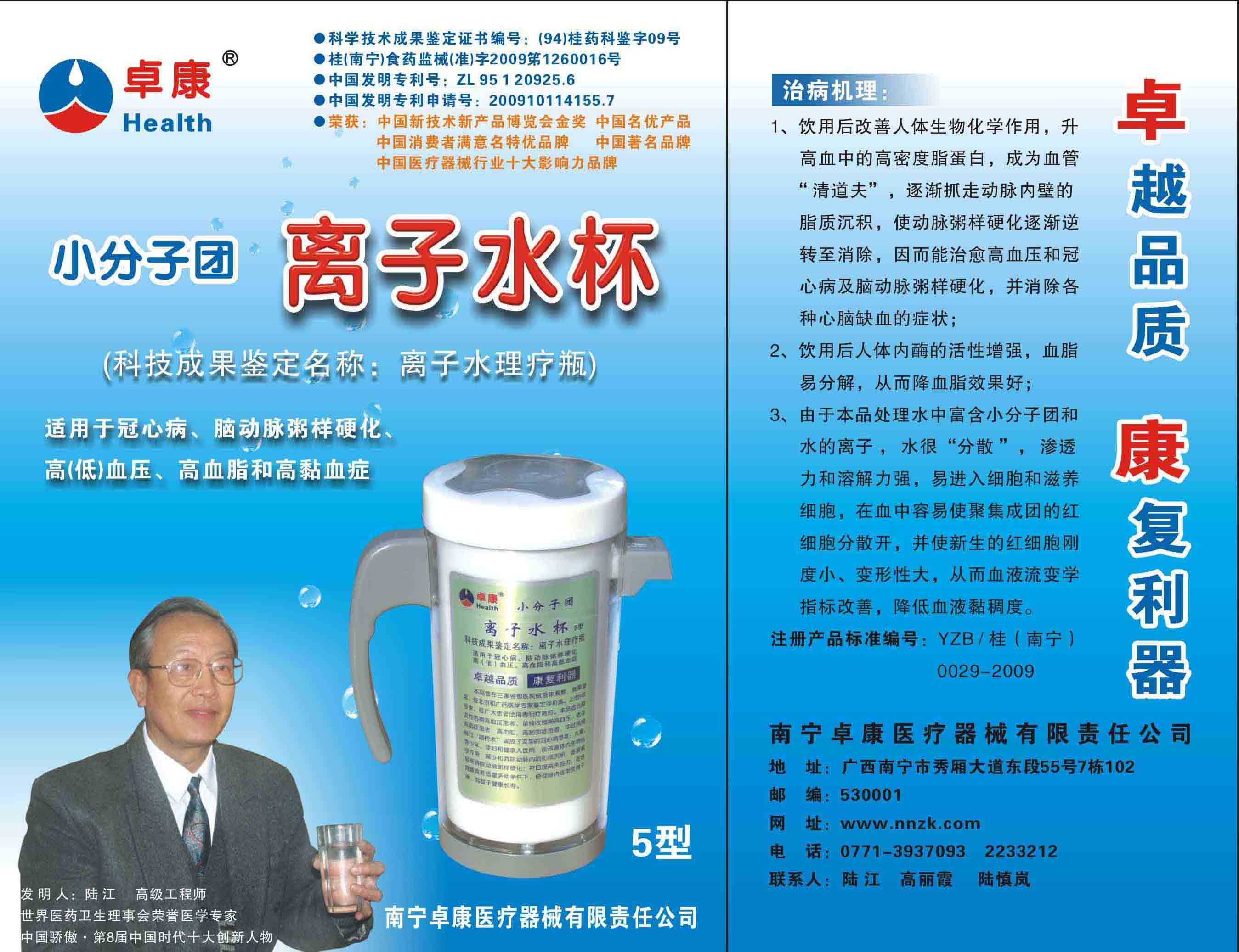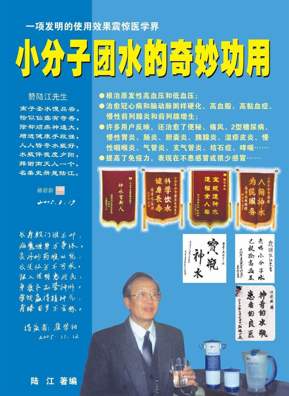 -----我是從事建筑的高工,本來沒有資格去攻克醫(yī)學難題,卻為了自身健康才扣響醫(yī)學的大門。由于我1990年患高血壓,因怕中風才研究發(fā)明了離子水瓶,我把水處理成微小分子團水,飲用后治愈了高血壓。便于1993年底送到三家省級醫(yī)院做臨床試用4個月。經(jīng)北京和廣西醫(yī)學專家鑒定:"降脂降壓效果好"," 能擴大心腦動脈流量,改善心腦電圖以及微循環(huán)","對治療心腦動脈粥樣硬化、高血壓、高血脂有良好的醫(yī)療保健作用。""產(chǎn)品的技術(shù)性能和療效達到了同類產(chǎn)品的國內(nèi)領(lǐng)先水平,經(jīng)廣西醫(yī)學科學情報研究所檢索,未見國外有類似報道。"中國醫(yī)學科學院張正國教授從美國國立醫(yī)學圖書館數(shù)據(jù)庫存Medline檢索英俄文資料,均未見類似報告。2000年上市后,我為了對消費者負責而繼續(xù)觀察研究,一直通過《信譽卡》和《質(zhì)量跟蹤調(diào)查書》向患者承諾療效,請用戶使用6個月后反饋效果。和脂壓患者飲用2至5個月內(nèi),消除癥狀,停服藥物,血壓正常;冠心病患者飲用3~5個月逐漸減輕至消除心絞痛、房顫等癥狀,不再服藥,飲用1年左右心電圖正常,經(jīng)冠脈造影掃描無明顯狹窄,表明冠心病痊愈。大量患者還反映許多衰弱器官被修復(fù),讓前列腺增生、慢性咽喉炎、慢性氣管炎、支氣管炎、慢性胃炎、腸炎和膽囊炎等不藥而愈;2型糖尿病患者是因為胰島衰弱致病,飲用該水半年至一年,逐漸減藥至停藥,血糖尿糖正常,真正治愈2型糖尿病。中風后遺癥患者飲用六七個月,可逐漸減輕至消除肢體和語言障礙,表明飲用該水能讓壽命很長的神經(jīng)元細胞逐漸修復(fù),奇跡般地恢復(fù)肢體和語言功能。飲用后還使胸腺和脾臟兩個重要的免疫器官被修復(fù)和增強,產(chǎn)生免疫細胞多,提高了免疫力,使人不生病或少生病。自此, 飲用微小分子團水創(chuàng)造了攻克冠心病、高(低)血壓和糖尿病三大醫(yī)學難題的奇跡。人們對此感到不可思議,但實踐是檢驗真理的唯一標準。