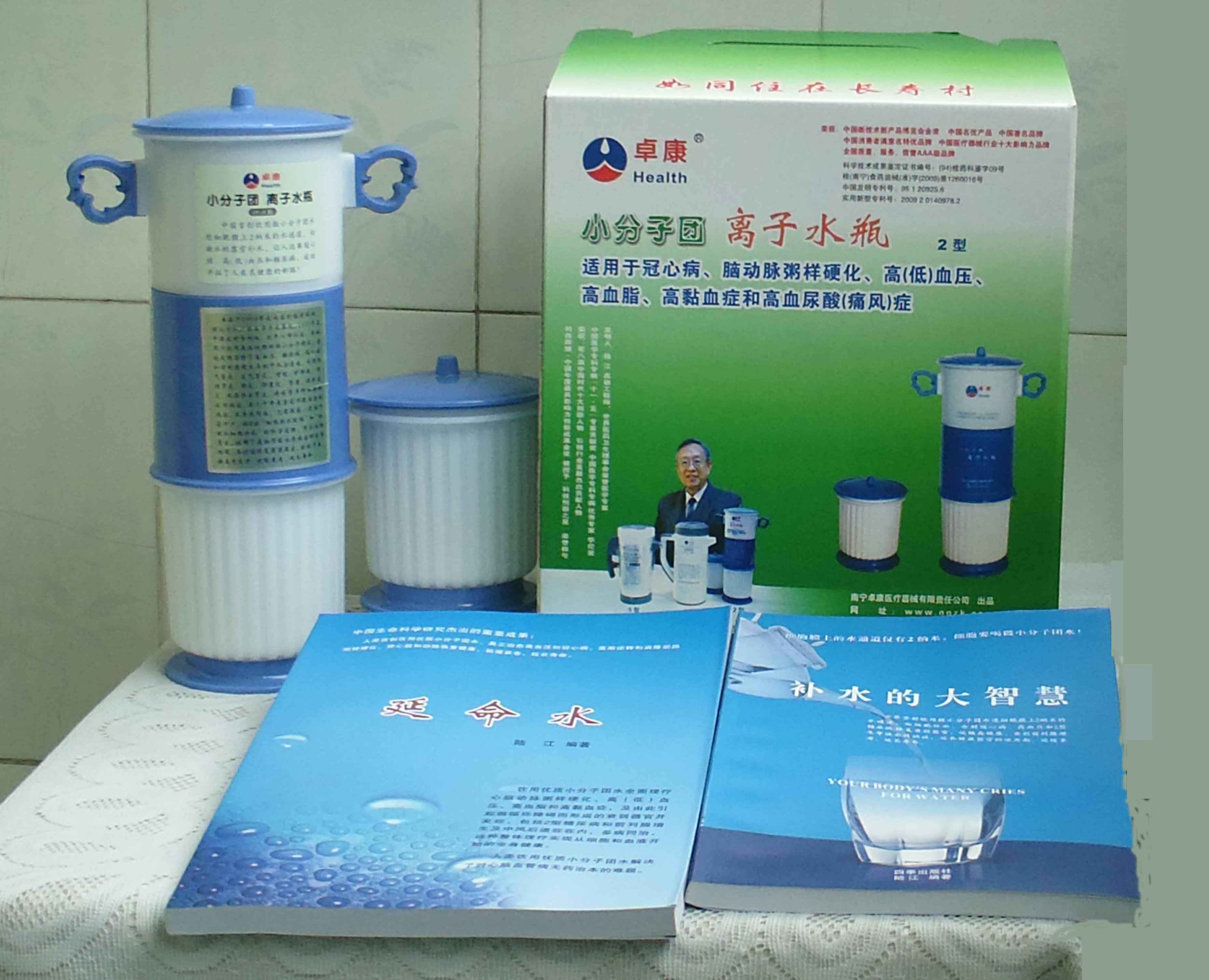 本品大量用戶的使用效果表明,能治愈冠心病、腦動脈硬化、原發(fā)性高(低)血壓、高血脂、高粘血癥、高血尿酸癥(痛風)和2型糖尿病、衰弱器官并發(fā)癥(前列腺增生、腎衰與尿毒癥)及中風后遺癥等療效好。產(chǎn)品配信譽卡。使用壽命30年,不換芯,易清洗。團購優(yōu)惠。從郵局匯款,匯費1%,地址按本頁下方地址、聯(lián)系人寫。從銀行匯款,請點擊[聯(lián)系匯款]欄,從工商銀行匯款,建設(shè)銀行、農(nóng)業(yè)銀行匯款,均免收匯費,匯款后20--30分鐘內(nèi)發(fā)短信,可用微信轉(zhuǎn)帳,均免匯費,微信號即手機號13768308380。匯款后,告知你的姓名和地址,我公司聯(lián)系人手機號是:13768308380。卓康牌離子水瓶為我公司獨家生產(chǎn),郵購產(chǎn)品配《補水的大智慧》彩印書一本,另配四季出版社出版的新書《補水的大智慧》一本,并配光盤一張(含央視主持人釆訪陸江的對話視頻)。目前市場和"淘寶網(wǎng)"上有人兜售假冒的偽品,望讀者審察辯別真?zhèn)?,造假者剽竊假冒本公司的各種認證、獲獎獎項、專利號和外包裝盒上的中英文字,包括科技成果的鑒定意見等,請讀者注意防偽。如何識別假貨?已經(jīng)買了假貨怎么辦?(請點擊[打假掠影][打假掠影])。