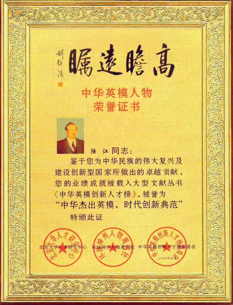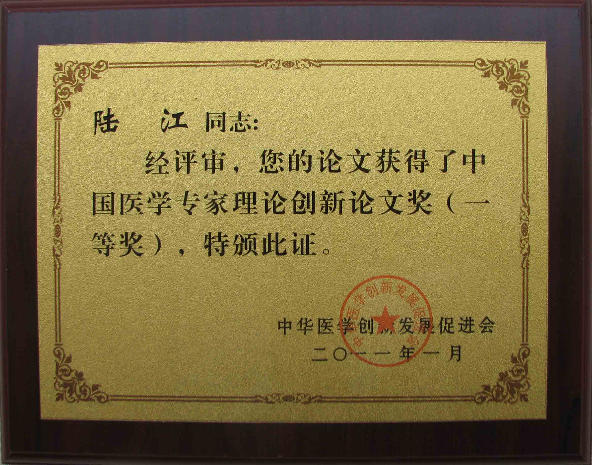 陸江的論文獲一等獎榮譽證書-- 陸江論文獲創(chuàng)新論文獎牌